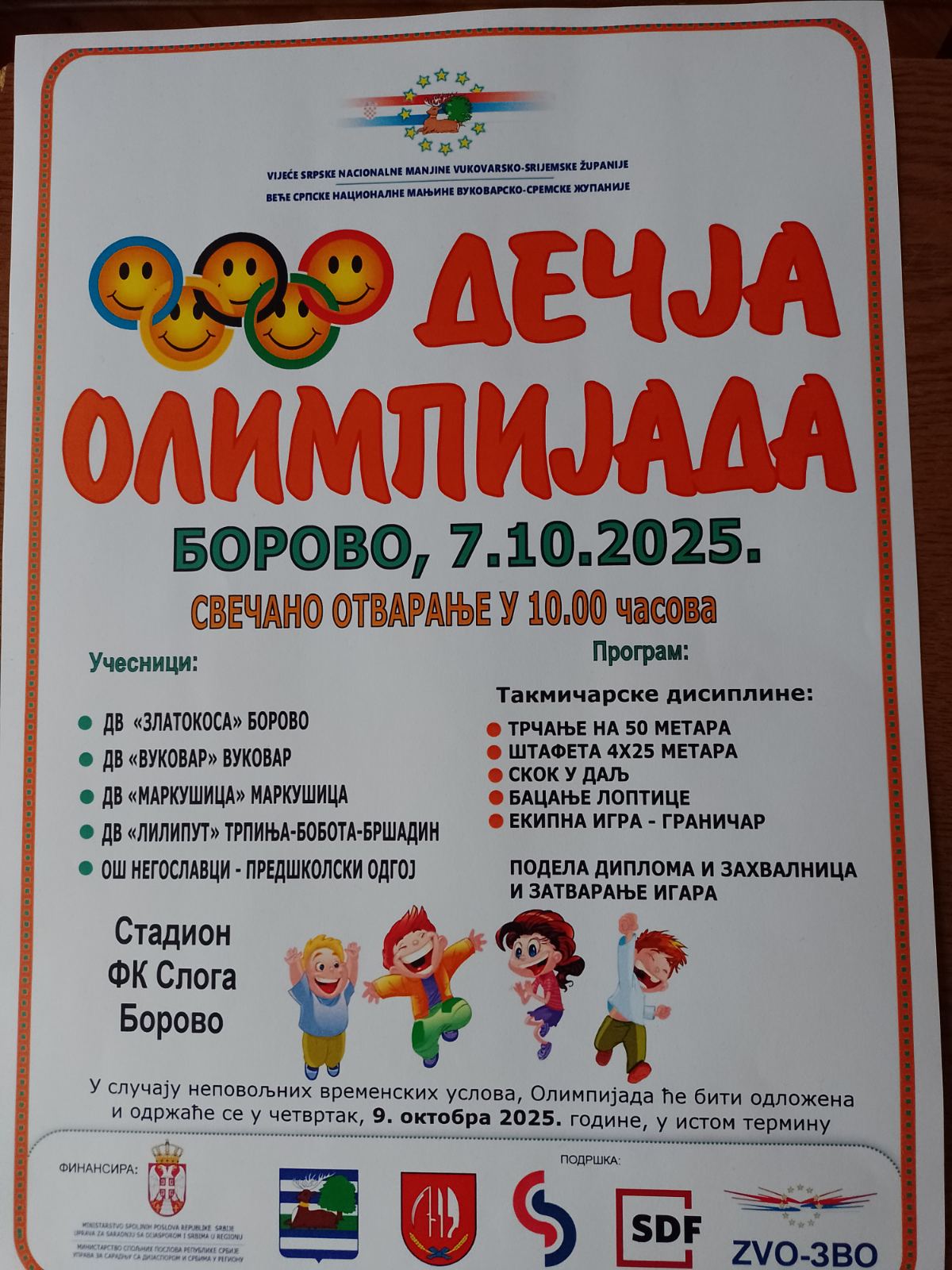 7.10.2025. Петнаеста Дечја олимпијада, спортско такмичење за децу предшколског узраста која похађају вртиће где се програм проводи на српском језику и ћириличном писму, одржана је у организацији Већа српске националне мањине Вуковарско-сремске жупаније. Домаћин је био Дечији вртић „Златокоса“ из Борова.