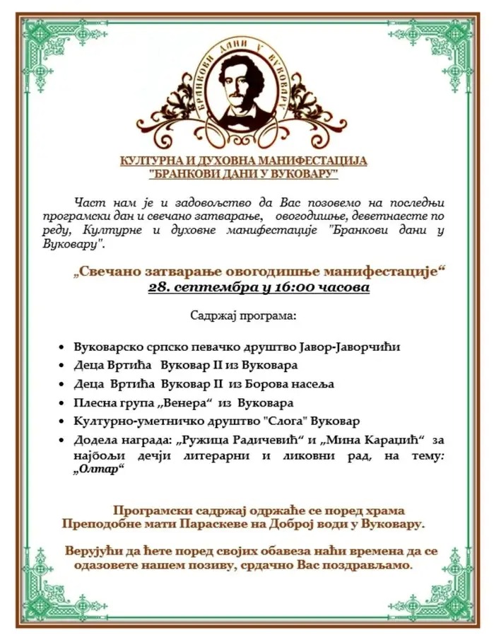 28.9.2025. Kao i prethodnih godina, djeca starijih odgojnih skupina "Čarobnjaci", "Lavovi" i "Vilenjaci", sudjelovali su na svečanom zatvaranju devetnaeste po redu Kulturne i duhovne manifestacije "Brankovi dani u Vukovaru". Hvala svima koji su podržali djecu i svojim prisustvom uveličali ovogodišnju manifestaciju.